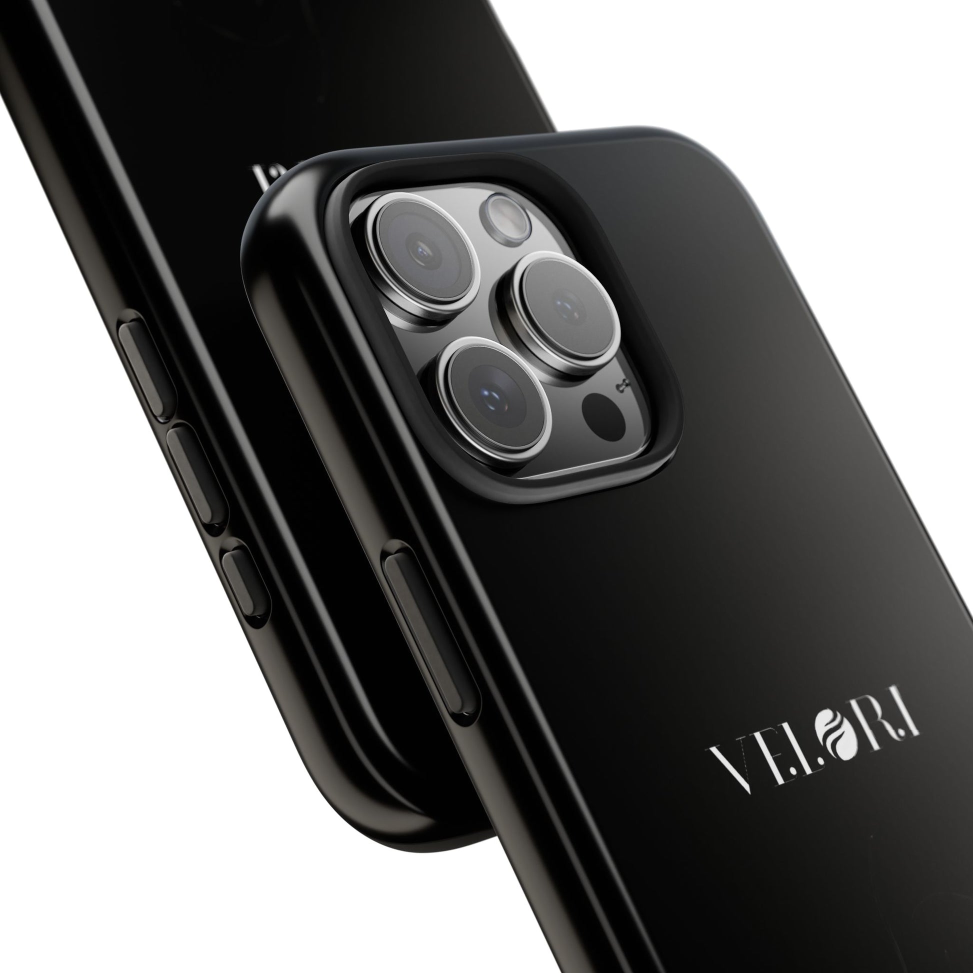 Glossy Black Tough Phone Case — Minimal ‘VELORI’ with Subtle Floral Silhouette
